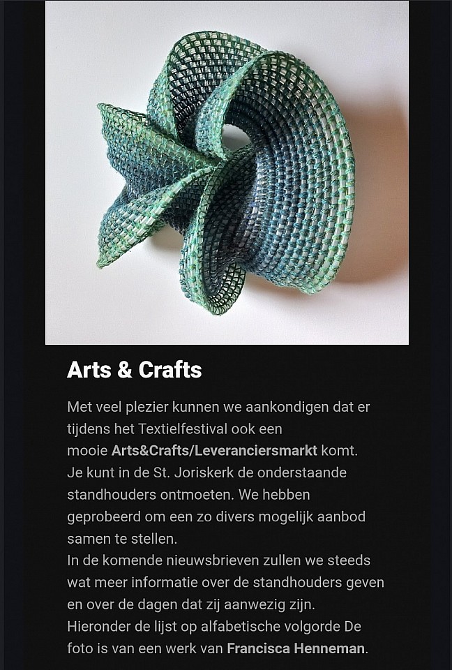 Ik ben op de Arts en Crafts Markt met sieraden en objecten op de vrijdag 22 mei en zaterdag 23 mei van 10.00-17.00 uur.